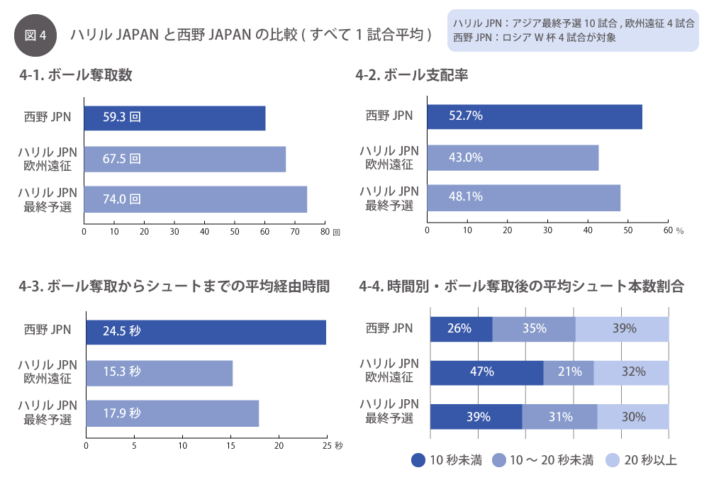 ボール支配率(図4-2)は西野JAPANのほうが52.7%と高く、一方でボールを奪ってからシュートを打つまでの平均経由時間(図4-3)は、ハリルJAPANは速く(最終予選:17.9秒、欧州遠征:15.3秒)、西野JAPANはそれより遅い(24.5秒)傾向が出ています。このデータから、ハリル監督下ではボール奪取数が多い=攻守の入れ替わりが多く、短時間でシュートまで持ち込んでいることがわかります。