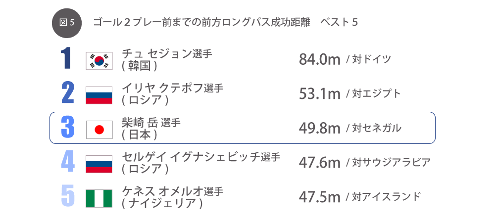 印象的だった選手を個別に見ていくと、まずは大会を通して評価の高かった柴崎岳選手。ゴールの2プレー前までの前方ロングパス成功距離ランキング(図5)を見てみると、セネガル戦での49.8メートルのパスがランクインしており、大会3位に入ります。