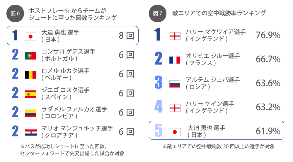 ちなみに大迫選手は空中戦でも光っていて、全試合中21回敵陣で空中戦に絡んでおり、うち13勝。61.9%の勝率で、大会5位となっています(図7)。
