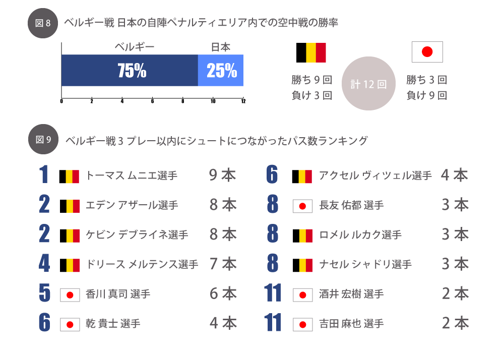 それから空中戦での勝率も見てみると(図8)、ベルギーが75%、日本は25%と、ゴール前で競り負けていたことがよく分かります。一方、この試合でのシュートチャンスを見てみると(図9)、日本では香川選手、乾選手、長友選手の活躍が目立ちました。中でも香川選手が、3プレー以内にシュートに繋がるパス回数が6本と最多で、アシスト面で効いていたと思います。