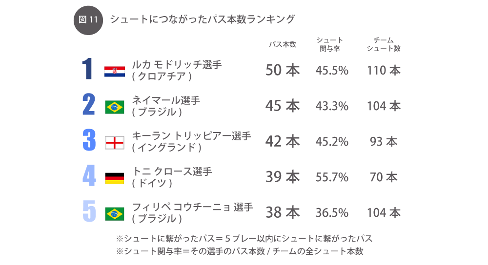 最後に、大会MVPを獲得したクロアチア代表のモドリッチ選手についても紹介させてください。シュートにつながったパスの数は大会1位の50本。チームの総シュート数は110本なので、およそ半数近くのシュートに関わったことがわかります。大会MVPとなったのも頷ける数字です。