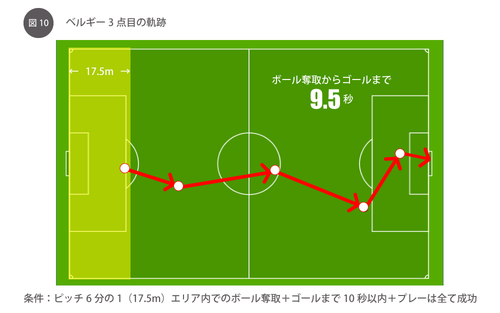 ちなみに、試合終盤でベルギーが見せた3点目のカウンターは、ボールを低いエリアで奪取し、9.5秒というスピードで、フィニッシュまですべてのプレーを成功させたという点で、2010年大会でも2014年大会でも見られなかった非常にレアなゴールシーンでした。その軌跡を示したのがこの図10です。