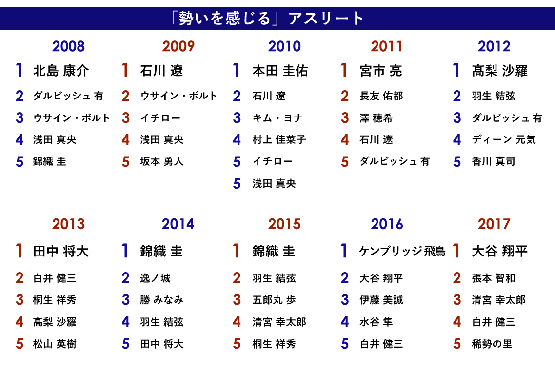 現在華々しく活躍しているといえる髙梨沙羅(スキージャンプ)、羽生結弦(フィギュアスケート)、白井健三(体操)、大谷翔平(野球)、伊藤美誠(卓球)、清宮幸太郎(野球)などは、総合ランキングでは上位にランクインしない年でも、この「勢いを感じる」の項目では、ベスト5位以内の上位にランキングされていました。アスリートにとっては、総合ランキングに入るような活躍を占う指標として「勢いを感じる」は重要な意味を持つのかもしれません。