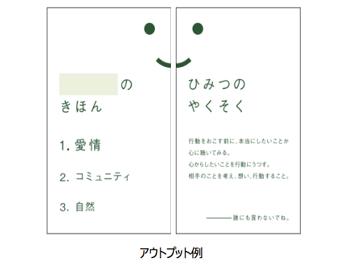 兎洞:いまの話をきいて改めて思うのですけど、僕、弥太郎さんと一緒に仕事をさせてもらって、本当にリスペクトしているというか、いいなと思うことがあって。すごく届く言葉を編み出しながらやっていっているという感じがあるんですよね。博報堂は広告の会社なので、コピーライティングとかそういう領域は強いのですが、何かちょっと違うんですよ。例えば、さっきの「自分に詳しくなる」という言い方もそうですし、極めつけは、「ひみつのやくそく」。このプログラムでは自分のことを一つ一つ言語化して、アウトプットすることを「ひみつのやくそく」としています。普通だったら「じぶんの宣言」とか「マニフェスト」とか言っちゃうところが、「ひみつのやくそく」ですもんね。