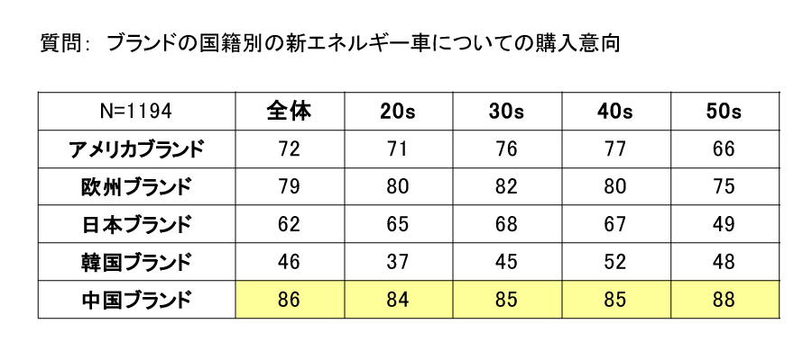 過去、ガソリン車カテゴリーにおいて、外国ブランドに対して中国国産ブランドが劣っていた認識がありましたが、今回の新エネルギー自動車に関する調査結果を見る限りでは、むしろ国産ブランドのほうがどの層でも高い支持率が出ていることは予想外でした。