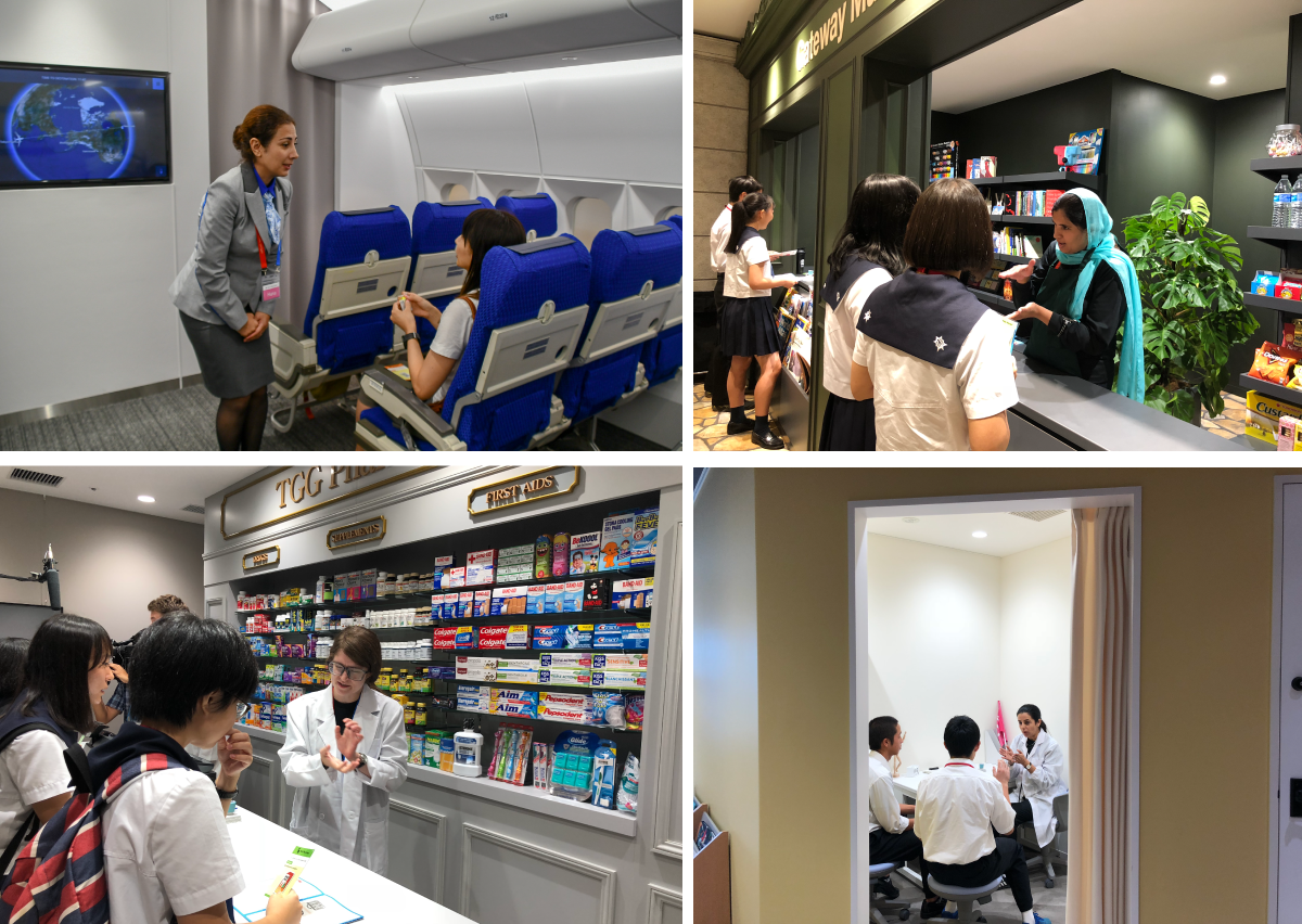 TGGには、英語を活用する「アトラクション・エリア」と、英語で学ぶ「アクティブイマージョン・エリア」があります。アトラクション・エリアには、薬局、ファストフード店、スーベニアショップといった店舗や、ホテル、病院など日常生活の場が再現されていて、そこでリアルに使われる英語コミュニケーションを体験できます。アクティブイマージョン・エリアでは、映像制作やダンスパフォーマンスから国際問題、ビジネス・プログラムまで、多様なテーマについてグループで企画、ディスカッション、発表をすることで、英語と知識を同時に身につけることができます。