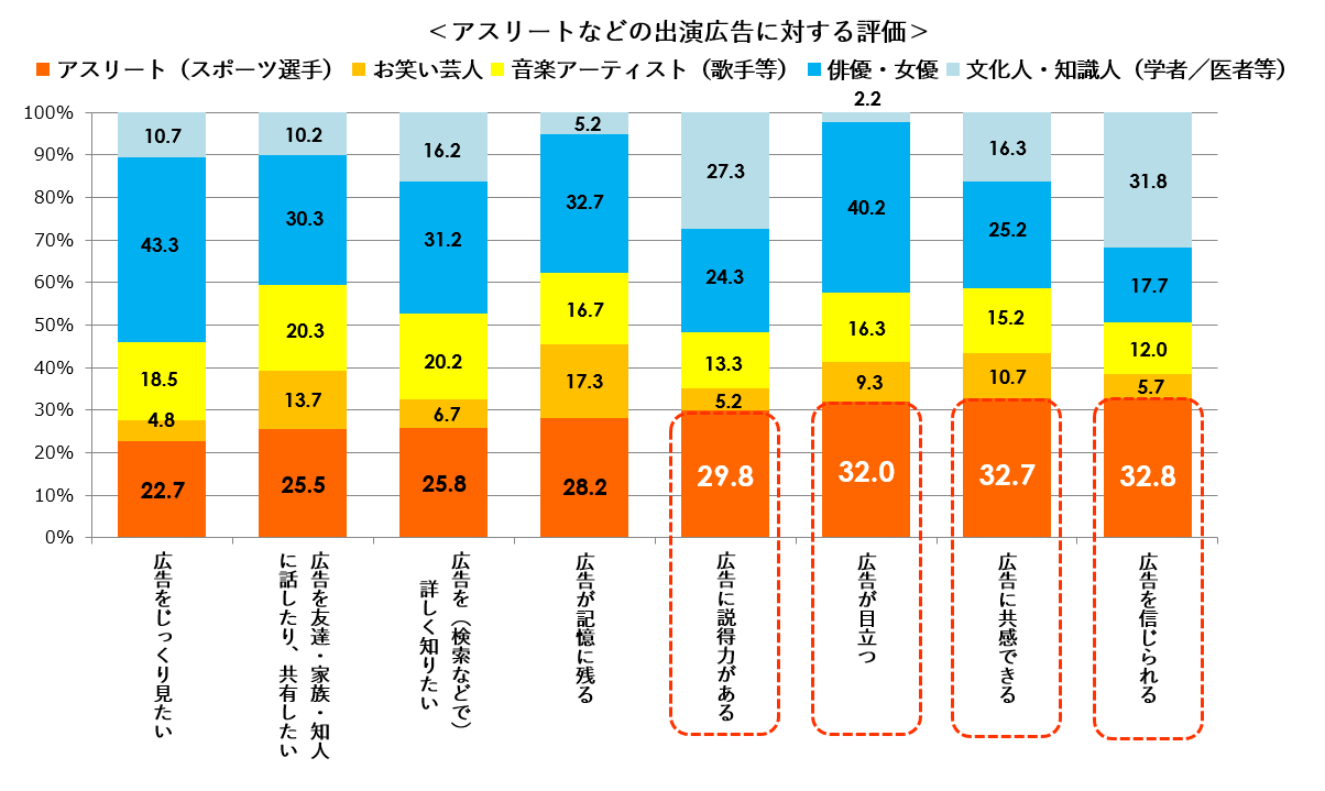 アスリートの出演広告に対する評価として数値が高かったのは、「広告を信じられる(32.8%)」「広告に共感できる(32.7%)」「広告が目立つ(32.0%)」が上位3項目になりました。俳優・女優の出演広告などと比べても、その上位3項目に加えて「広告に説得力がある(29.8%)」といった項目が高くなりました。