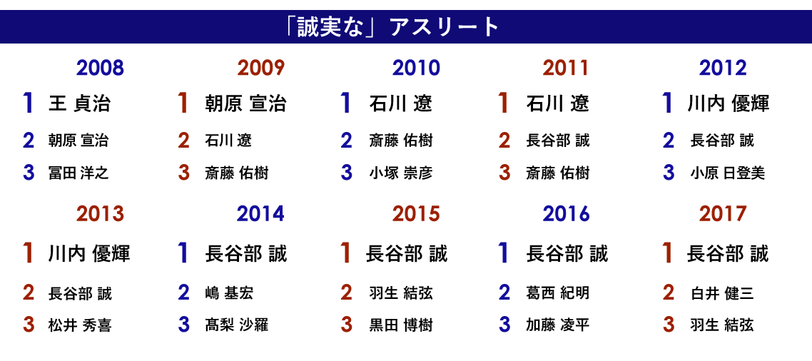 アスリートイメージ評価調査の29項目のイメージのひとつに、「誠実な」アスリートがあります。10年を振り返ると1位になったのは2008年王貞治(野球)、2009年朝原宣治(陸上)、2010年・2011年石川遼(ゴルフ)、2012年・2013年川内優輝(陸上)、2014年~2017年の4年連続で長谷部誠(サッカー)となりました。