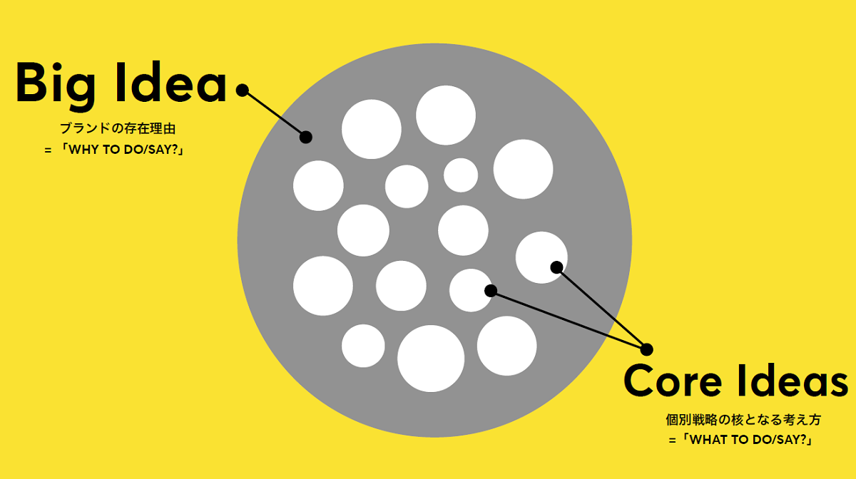 かつて広告業界は、「ビッグアイデア」をよく議論していました。ビッグアイデアとは「ブランドがこれからも世の中に存在するべき理由」を言語化したものです。ビッグアイデアと混同される言葉に、「コアアイデア」という言葉があります。コアアイデアは広告・マーケティングの個別施策の軸となる考え方です。ビッグアイデアとコアアイデアの関係は図2のように表現することができるでしょう。ビッグアイデアというしっかりとした土台があるからこそ、多様なコアアイデアに一貫性を与えることができるのです。