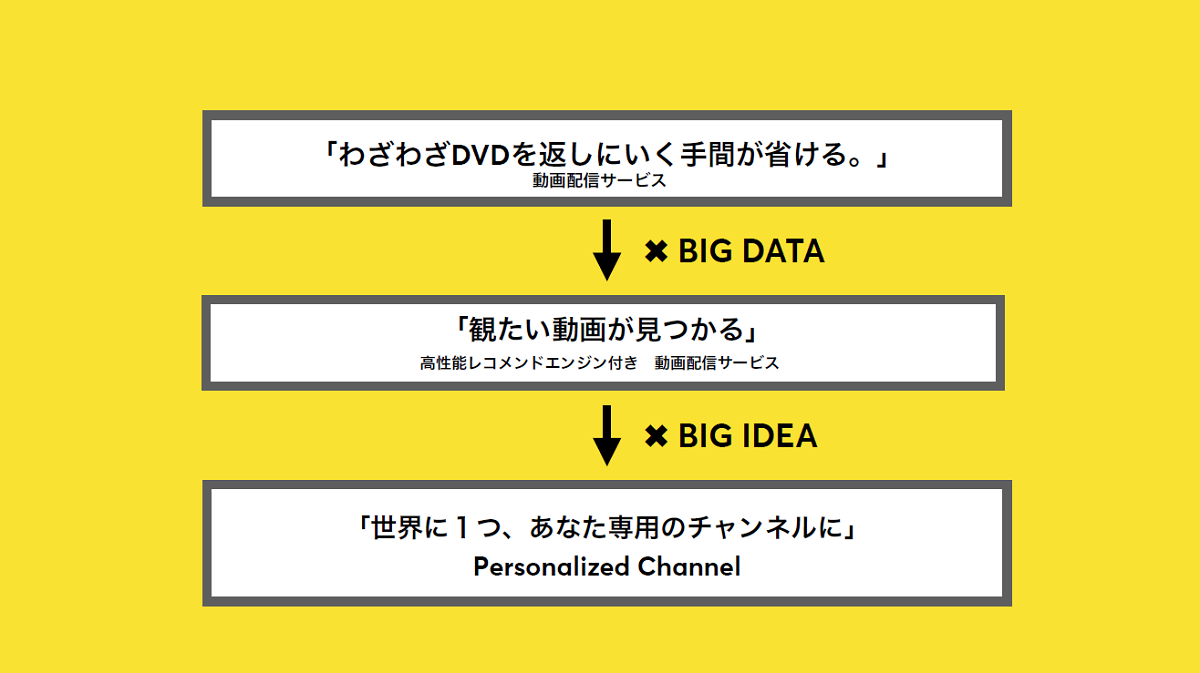 例えば、オンラインでの動画配信サービスを例にとりましょう。多くの動画配信サービスは店舗型のレンタルサービスに対して「わざわざ返しにいく手間が省ける」ということを価値としていました。次の段階として、彼らはビッグデータを活用し始めます。するとユーザーの個人的な嗜好に合わせて、観るべきコンテンツを正確にレコメンドすることができるようになる。これが「高性能レコメンドエンジン付き動画配信事業」と呼べる段階です。