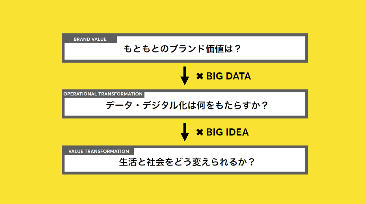 次に視点を「生活者」に変えます。データの活用が、生活者にとってどのような生活変化をもたらすのか、人々を歓喜させる物語はどう紡げるのかと考えるのです。その答えとなる新しい存在理由(=ビッグアイデア)が生活者にとっての価値となっていなくてはいけません。