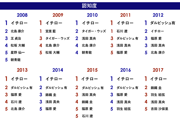 博報堂DYグループが実施している「アスリートイメージ評価調査」は2008年から調査を開始し、今年で10年となりました。調査スタート当初から、すでにイチローはスーパースターでしたが、様々なイメージ項目でいつも上位に顔を出していました。29のイメージ項目のうち、目立った項目について、どのような傾向があるのか追跡してみようと思います。