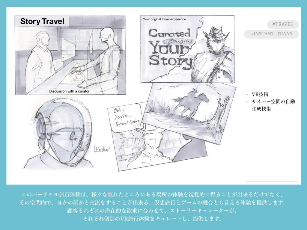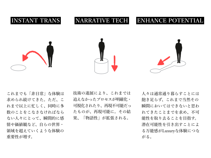 私たちは事前に世界各地の先進事例のリサーチを行い、「未来の贅沢」を考える上で必要な3つのアイデア設計の方向性(=デザインストラテジー)を定義しました。それが「INSTANT TRANS(瞬間的な異世界への移動)」「NARRATIVE TECH(テクノロジーによるストーリー性の拡張)」、「ENHANCE POTENTIAL(「潜在不可能性」の排除)」です。