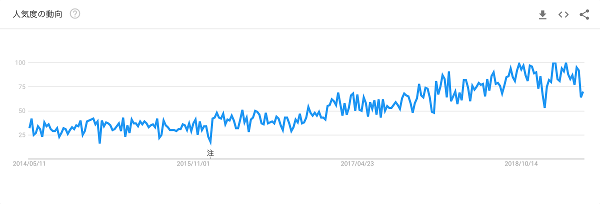 その証拠に、Googleトレンドで「コワーキングスペース」の検索推移を調べてみると、今もなお、その検索数が上昇傾向にあることが伺えます。