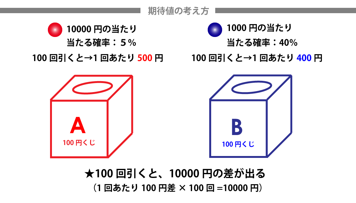 正解は、「Aの箱」を引き続けるべきです。「Aの箱」はくじ1回の当たりは1万円ですから、確率が5%ということは、1回当たり500円当たることに等しい。一方で「Bの箱」は、1000円の当たりで確率40%ですから、1回当たり400円です。だから、くじを100回引いたとすると、上振れあるいは下振れがあるかもしれないけれども、期待値としては1万円(=100円差/回×100回)の差が出るわけですね。