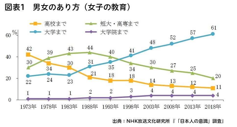 村田 子どもの教育に関する意識も変わっています。仮に中学生の子どもがいた場合に、どの程度の教育を受けさせたいかという質問があります(図表1)。以前は、男子は大学までの教育を受けさせたいが、女子は高校までや短大まででいいと考える人が多かったのですが、1988年調査からは、女子でも「大学まで」という回答が増えはじめ、2018年では61%となっています。平成の30年間で最も変化が大きかったのがこの項目です。おそらく、86年の男女雇用機会均等法施行の影響が大きかったと思われます。もっとも、男子の教育は大学まで必要と考えている人は2018年に72%で、男子と女子の間にはまだ10ポイントほどの開きがあります。