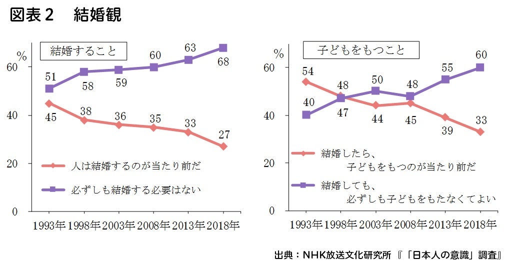荒牧 男女関係に関する意識では、1973年時点では「結婚するまでは性交渉をすべきではない」という意見が多数でした。しかし、現在では「深く愛し合っていればよい」という考え方が多くなっています。また1993年の調査から新たに、結婚観に関する質問(図表2)を設けたのですが、「必ずしも結婚する必要はない」「結婚しても、必ずしも子どもをもたなくてもよい」という意見が長期的に増加し続けています。