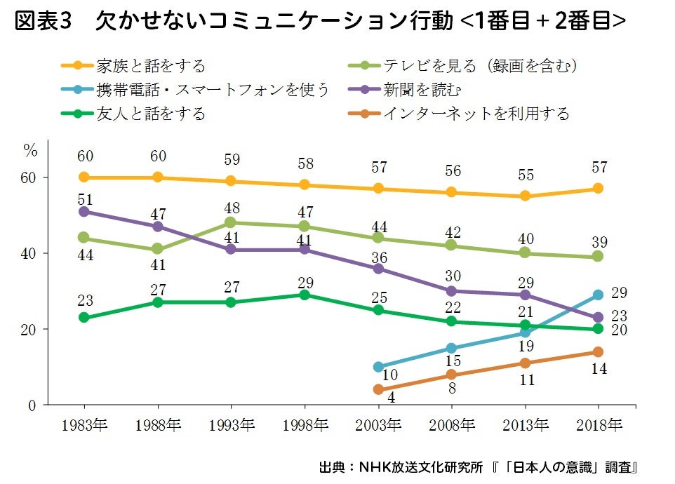 荒牧 私たちの調査では家族観に対する直接的な質問はないのですが、例えば、「欠かせないコミュニケーション行動」については、「家族と話をする」という回答が常に上位になっています。このことから、家族の価値が低くなっているわけではないといえるのではないでしょうか。