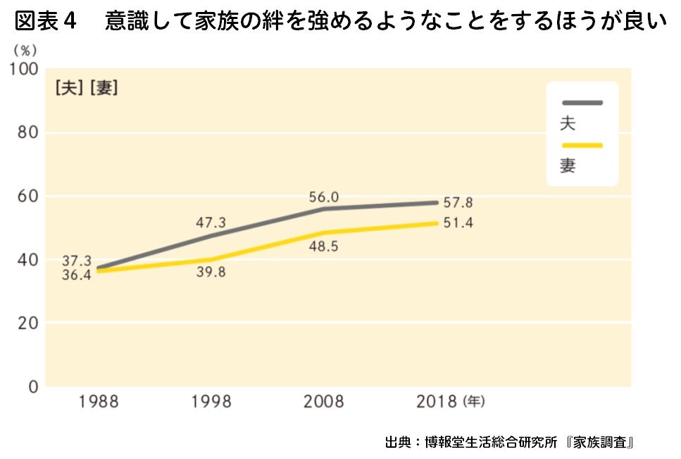 三矢 生活総研の調査でも、「意識して家族の絆を強めるようなことをするほうが良い」と考える人が増えています(図表4)。