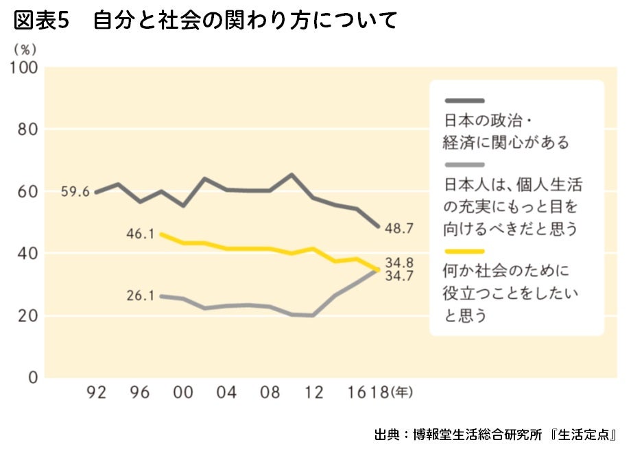 村田 「日本人の意識」調査の生活目標についての質問でも、例えば、「みんなと力を合わせて、世の中をよくする」ことを重視する人がかなり減っているところに同様の傾向がみられますね。