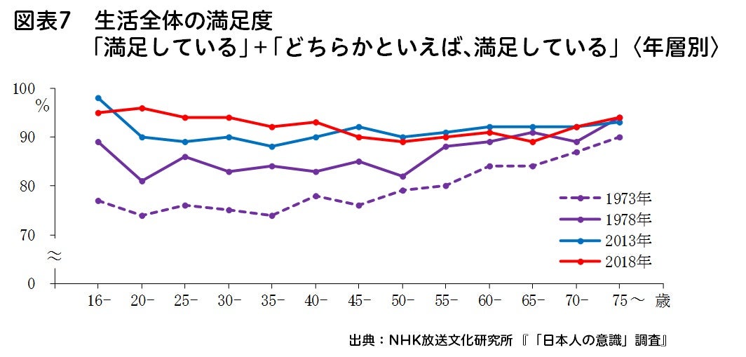 吉澤 調査が始まった73年時点では、若年層の満足度が低く、年齢が上がるにしたがって満足度が上がる傾向がみられました(図表7)。しかし、現在ではすべての年齢層で9割前後の満足度となっています。とくに2018年の最新調査では若年層の満足度が高くなっています。