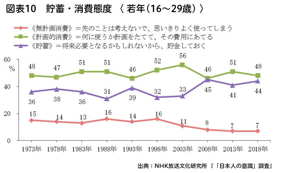 吉澤 おっしゃるとおりですね。若年層をみると、2018年調査では、73年と比べ、「無計画消費」は半減しています。一方で、「貯蓄」は以前より増えています。高齢者よりも若者に将来不安があるという傾向の表れかもしれません。