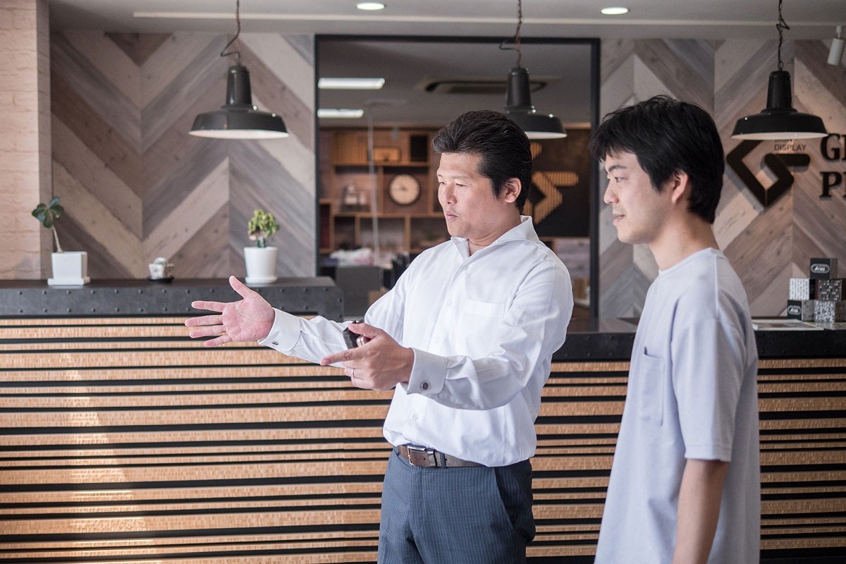 小泊:グランド印刷は、私の父が北九州の門司(もじ)で創業したシルクスクリーン印刷の会社です。私は、最初は別の印刷会社に勤めたあとでインターネットのベンチャー企業に転職し、それを経て、17年ほど前にグランド印刷に入社しました。主に、他の印刷会社さんや看板屋さんの下請の仕事をしていました。