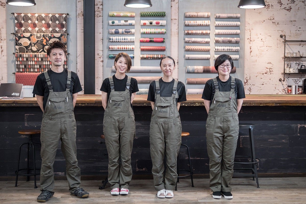 Arms チームのみなさん。つなぎのユニフォームも自分たちで考え、制作。取材の前日に、オフィスに傘立てが必要だということで、DIYで傘立てを制作していたとのこと。就業時間中にそうした取り組みを行うことが許されている。