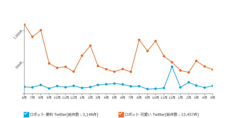 さらに、「ロボット」が「便利」という単語とともに投稿されている数と比較してみても年間通じて、「可愛い」と投稿されている数のほうが多いことが分かりました。