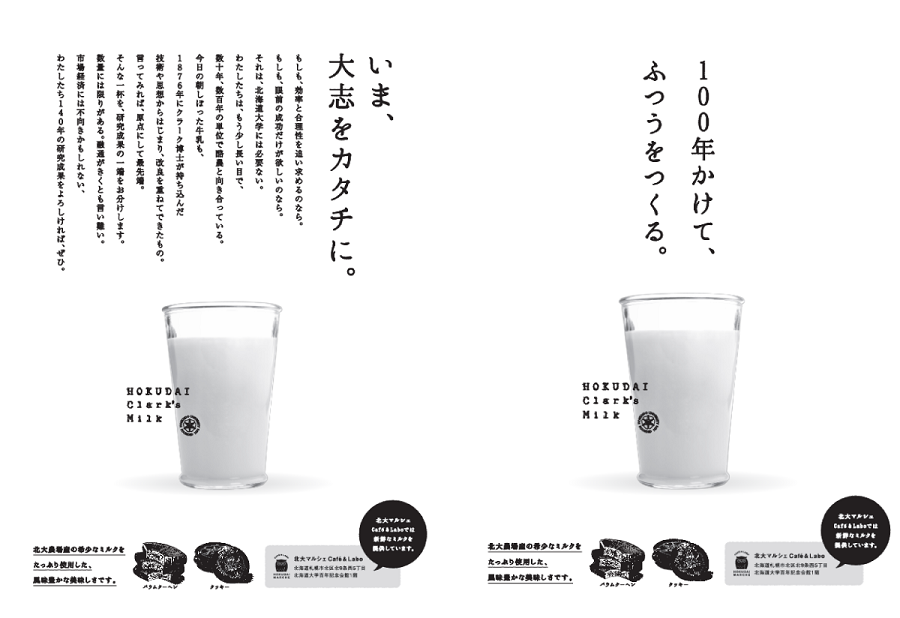 これはクリエイティブディレクターが色々と北大で取材をさせていただく中で、140年前に北海道に来た乳牛が今でも続き、そして後継されているということも驚きなのですが、140年間、毎日研究している、ということ自体がブランドなんじゃないかという話になったんですね。日々改良して日々研究して、牛の健康を保ちながらいい牛乳を作っていきたい、というような、今日明日すぐできるものではなくて、これからの北海道の人のために、50年、100年、150年先のことを考えながらやっている。それで、「100年かけて、普通をつくる。」というコピーが生まれたんです。こつこつやりながらいい品質を求め続けていく姿勢っていうのが、その志みたいなところがコアにあると思っています。「今、大志をカタチに」はそのような想いから発想しています。「Hokudai Clark’s Milk」というブランド名も、おいしいお菓子ができただけではなくて、研究資産が形になったというか、研究資産こそがこの商品の中心にあって、それを皆さんに届けていきたいと考えました。そこに込められた「想い」のほうを買ってもらうみたいなイメージです。