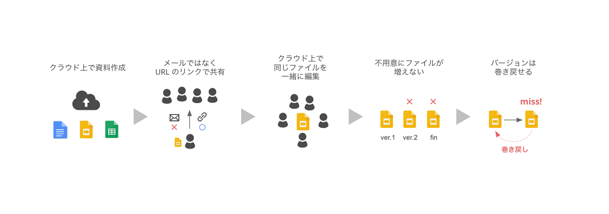 まず一つ目に、前章で説明があったように、社内外問わず全員がクラウド上にアップロードされた一つの資料を閲覧・編集しているため、各々が閲覧・編集している資料のバージョンが違っていたということが起こりません。
