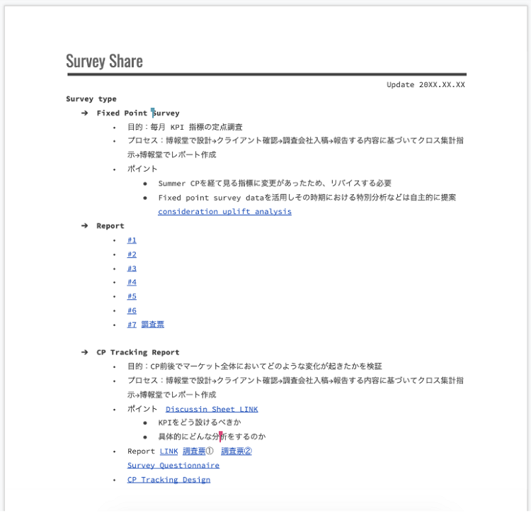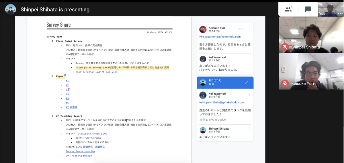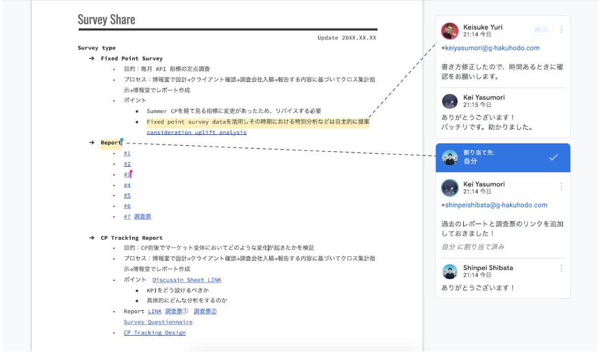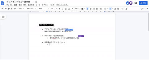 私たちはスプレッドシートやドキュメントを、クライアントの皆さんで共同で更新する議事録メモや、インタビュアーとも共有した追加質問用メモとして活用しています。