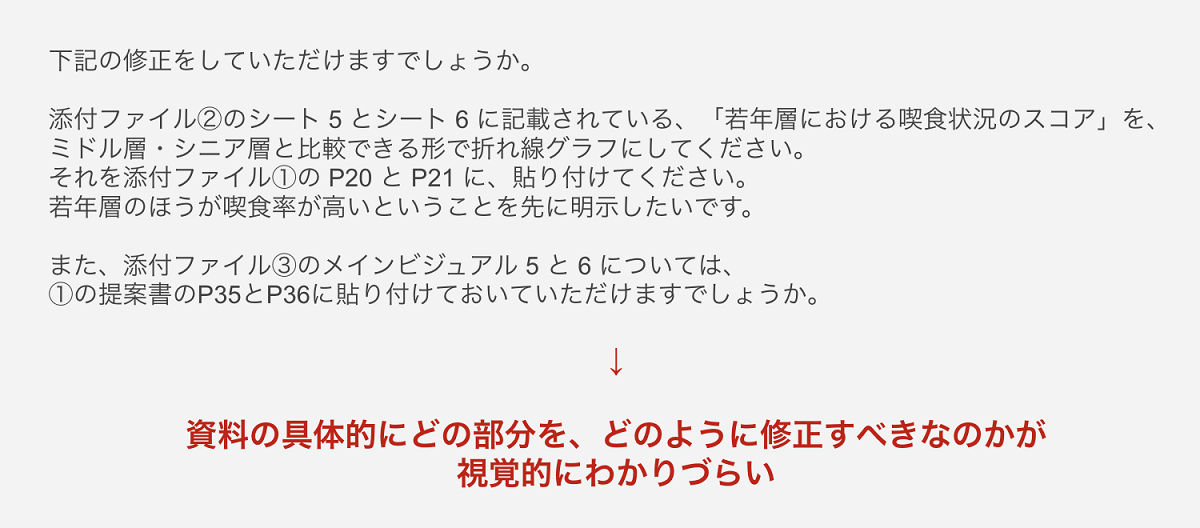 また、メールで修正指示をやり取りする場合は、基本的に文章で説明する必要があるため、視覚的にどの部分をどのように修正すべきかがわかりにくいです。電話でやりとりをしたとしても、メールよりは伝えやすくはなりますが、やはり視覚的にどの部分を修正するかまでは把握できません。