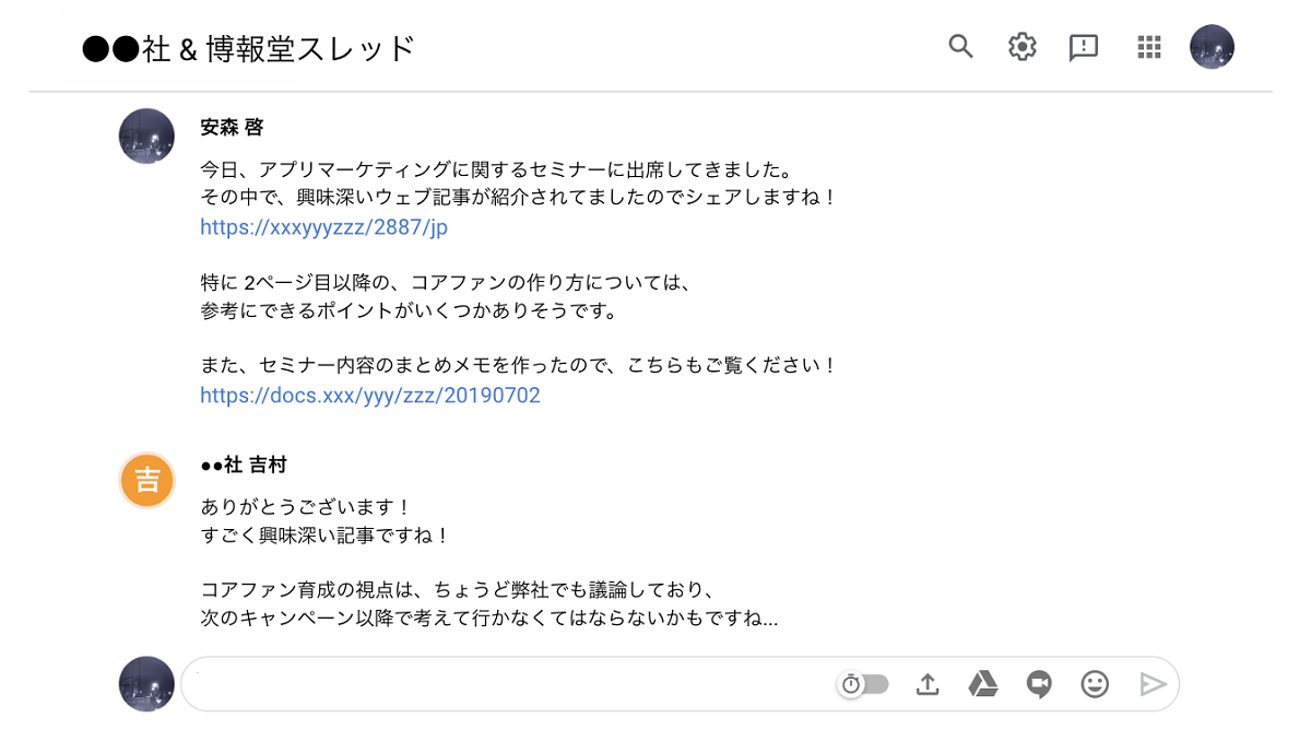 その結果として、業務に関する質問はもちろん、直近の業務には直接関係しない参考情報のやり取りまでもが活発になります。私自身も、得意先の方と興味深いデータや知見のやり取りなどを日々チャットベースで行っています。