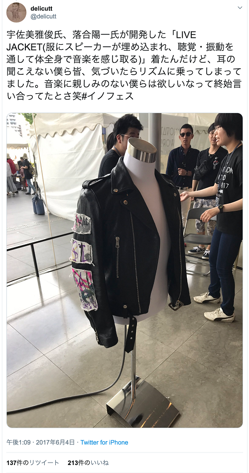 それは、つくばで開催されたイベントでライブジャケットを体験したデフサッカー(聴覚障がいのある人のサッカー)選手・仲井健人さんのつぶやきで、「耳の聞こえない僕ら皆、気づいたらリズムに乗ってしまってました」「音楽に親しみのない僕らは欲しいなって始終言い合ってたとさ」という内容でした。