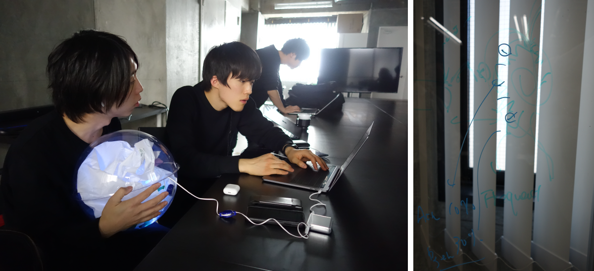 僕自身がこだわった点は、一枚絵としての強さ、でした。ただ丸いだけではなく光る球体にして、低音なら青、高音なら赤と、音の高低によって色が変わる設計を加えていきました。それによって、視覚でも音楽を楽しめるものになりました。