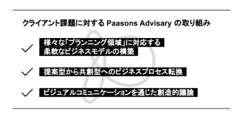 緻密な市場分析、的確な課題設定、斬新なアイデア、いずれも提案側の広告会社と受け手であるクライアントが異なる認識を持ってしまうと、当然ながら意味をもちません。特に異なる言語や文化の人々が意思決定に関わる外資企業の場合にはこのリスクは致命的です。いかに直感的に、素早く、明快な共通認識を作ることができるかを我々Paasons Advisoryメンバーは日々悩み続けてきました。