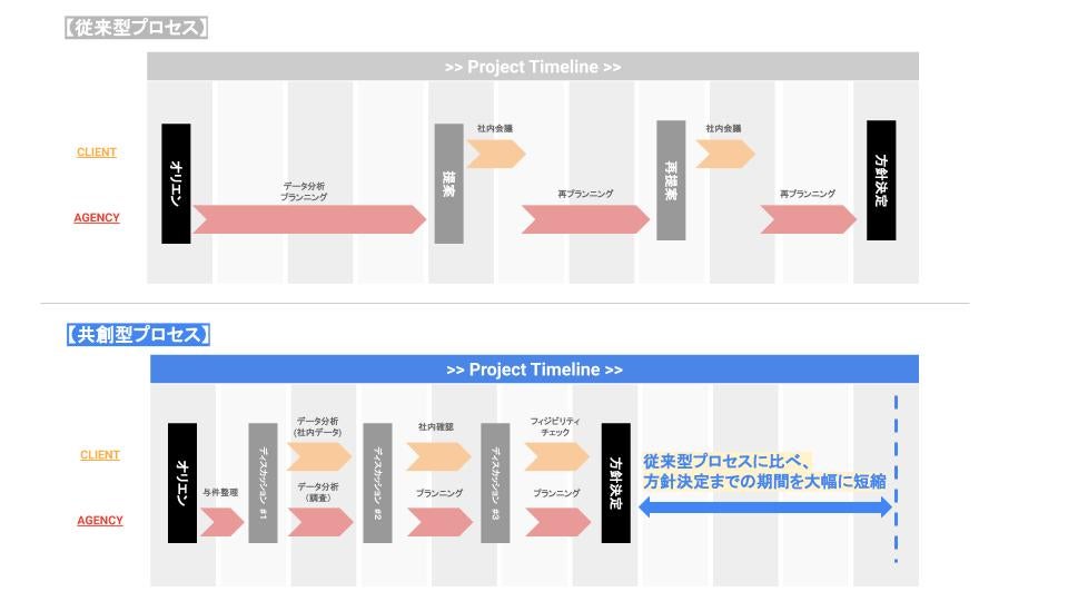 これまで、広告会社とクライアントとの間でのプロジェクト進行の多くは、クライアントからのオリエンテーションがあり、それを受けて広告会社がプランニングとプレゼンテーションを行い、クライアントによる提案へのフィードバック、そしてそれを踏まえた再プランニング・再プレゼン、というサイクルによる進行が主流でした。双方のキャッチボール形式で進行するこのプロセスは、クライアントの意思決定と広告会社の企画時間がある程度確保できる場合には、これまで通り機能するプロセスですが、前述のような意思決定が柔軟で速いクライアントの場合には、商品やサービスの最新アップデート内容を提案に反映できなかったり、そもそもクライアント内で方針が変わって意図と異なる提案をしてしまうリスクを孕んでいます。