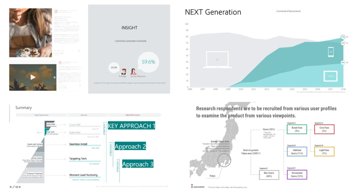 アイデアを提案したり調査レポートを提供する場合、伝える中身の正確性やクオリティもさることながら、それをどのように伝えるかという点もとても重要です。スタートアップ、テック系のクライアントは、直感的に短時間で理解することができるアウトプットを好む傾向があり、外資系クライアントではさらに文化や言語の壁も出てきます。そのため、より一層視覚的に構造を把握したり、感覚的に内容を理解することを促す工夫が期待されます。ビジュアルコミュニケーションはこうしたクライアントに対して有効で、まさに「百聞は一見にしかず」です。このような可視化アプローチを私たちは”Visibility”と呼び、資料の表現方法やデザインも含めて、インスパイアリングな資料をつかって創造的な議論ができるよう心掛けています。