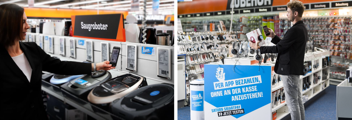ドイツの家電量販店「Saturn」は、店内を歩きながら(=ショールーミング)、アプリでほしい商品のバーコードを読み取り、アプリ内の買い物かごに追加していく方式をとっています。アプリ上での決済が完了すると、家電に取り付けられた防犯タグが自動で外れ、レジを通ることなくそのまま家に持ち帰れるという仕組みです。高額商品であっても、「欲しい」と思ってからノータイムで決済できるため、スムーズな買い物を実現しています。
