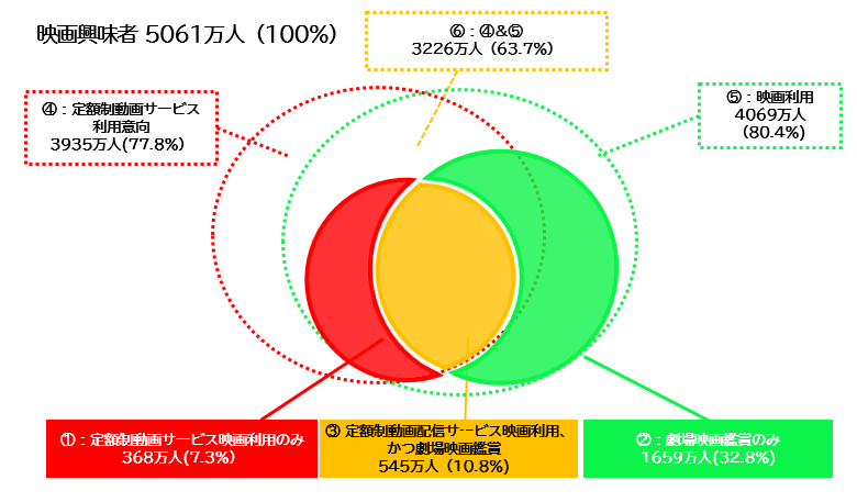 前編では、定額制動画配信サービス(=サブスクリプションサービス ※通称「サブスク」)利用者と劇場映画利用者の関係性を現状利用と今後の利用意向を踏まえ下記の様に図示した。映画に興味を持つ人の中で、現状のサブスク利用者はまだ大勢ではないが、今後の利用意向を含めるとその割合は約8割となり、大きなポテンシャルを示すように感じられた。この通りに今後サブスク領域が広まって行った場合、既存の劇場中心の映画ビジネスはどうなってしまうのだろうか。