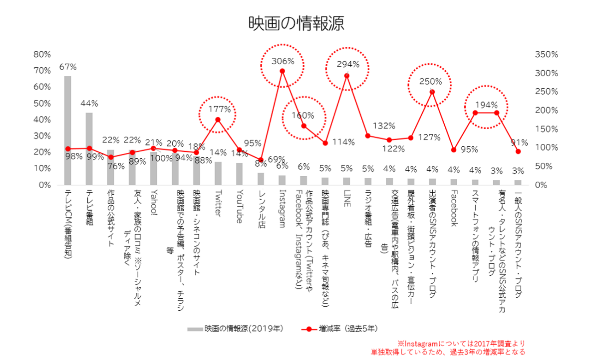 メディア全体ではここ数年、デジタル化が進んでいるが、映画の情報源においても同様の傾向が見られる。以下のグラフは、映画の情報源となったメディアの2019年の利用率と、過去5年間の増減率を表したものである。