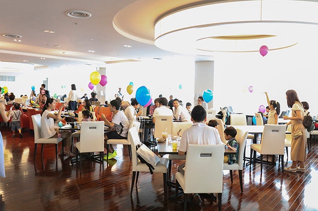 来場者は200組664名。うち、子どもは293名。家族構成はさまざまでしたが、やはり目立つのは子どもたち。小さな子どもたちにとっては、禁断のパパ・ママのオフィスに入るだけでも事件! 絨毯が敷き詰められた長い廊下、カフェの特製お子様ランチ、風船、役員室フロアから見る東京の景色、最新のテレビ体験など、めいっぱい楽しんでくれました。