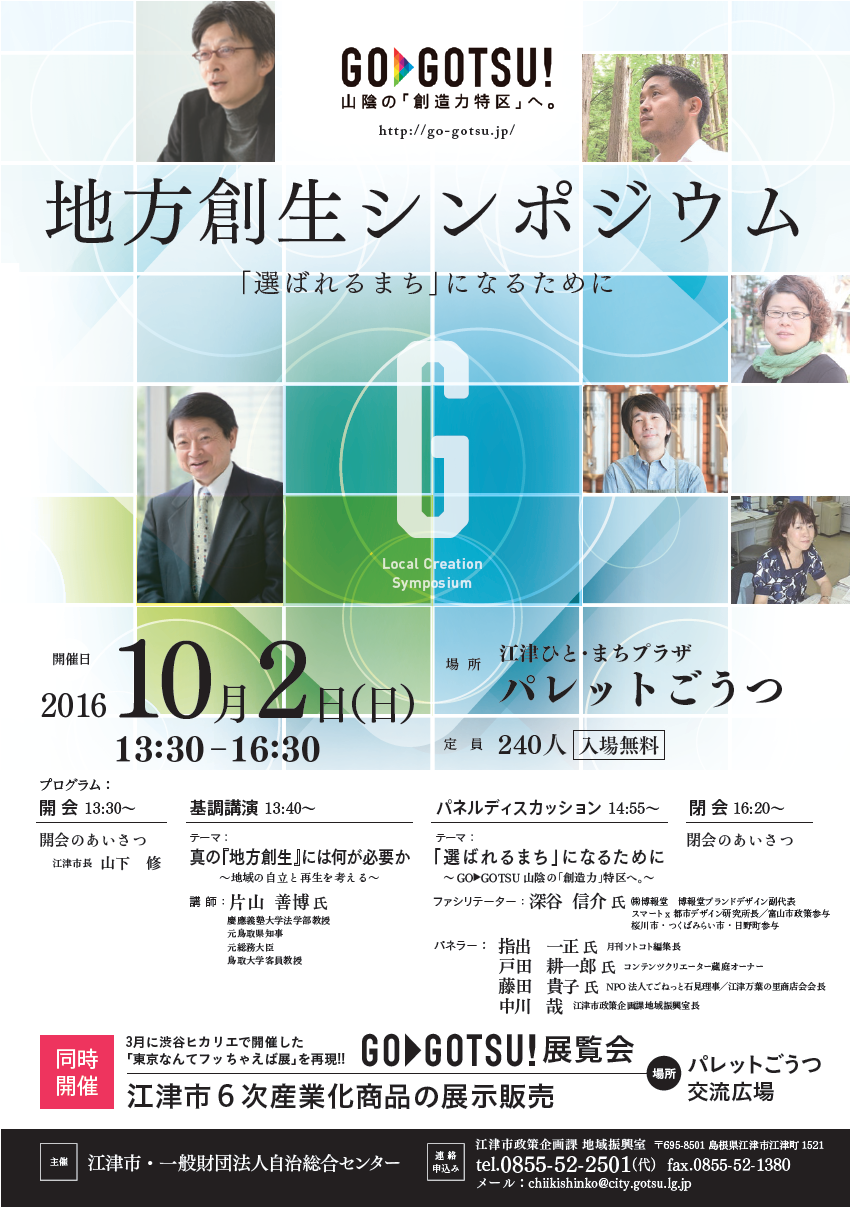 「真の地方創生は、ウイークポイントを見定めることからはじまる」という元総務大臣・元鳥取県知事である慶應義塾大学教授片山善博氏による基調講演のあと、パネルディスカッションは、「『選ばれるまち』になるために~GO▶GOTSU! 山陰の『創造力特区』へ。~」をテーマに、下記メンバーで進行しました。