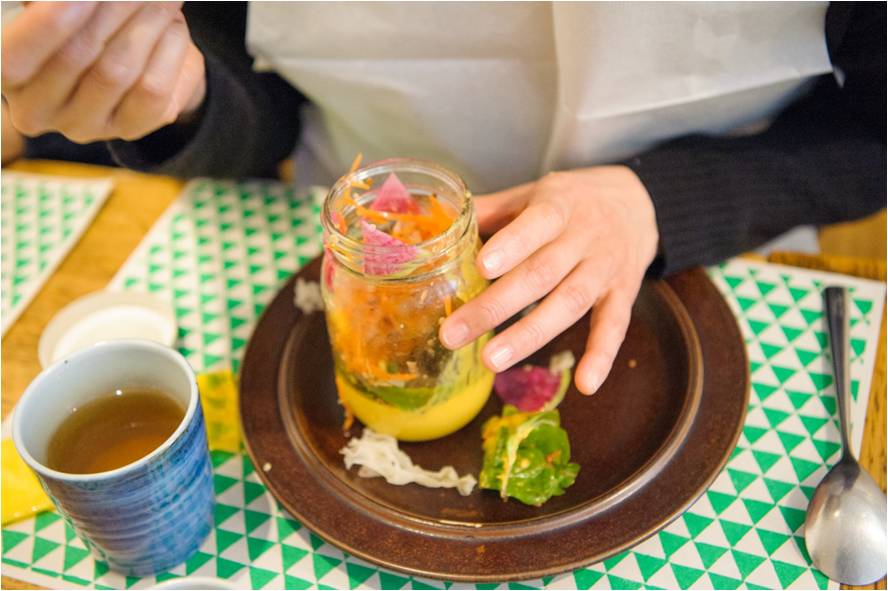 聞こえてくるのは年老いた女性と若い女性の会話劇。どうやら若い女性は、年老いた女性の面倒を見ながらもイライラしている様子で、「さっき食べたのにもう忘れちゃったの」などと言いながらしぶしぶ年老いた女性に食事を出します。同時に、目隠し状態の参加者の前に置かれたのは一品目のジャーサラダ。手探りで手元を確認しながら、恐る恐るスプーンやフォークを手に取って食事を始める参加者たち。視界を遮られた状態で、小さい瓶の口から細かく刻まれた野菜やムースを食べるのは思いのほか難しく、ぽろぽろと口元からこぼしてしまいます。