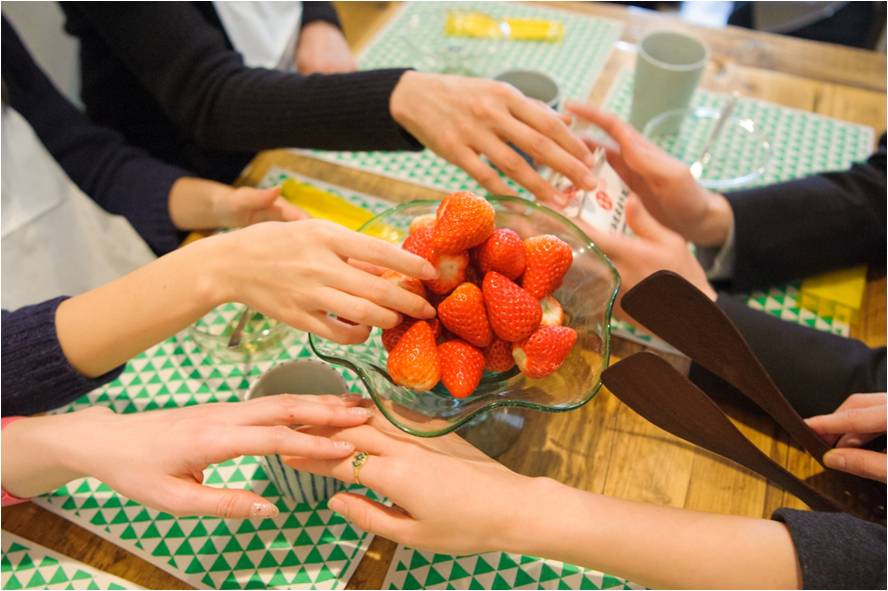 最後に訪れる未来では、年老いた女性は若い女性に頼まれいちごミルクを作ることに。参加者たちの前にもいちご、牛乳、練乳とお皿が置かれます。二人一組となった参加者たちは、声を掛け合いながら手探りでいちごミルクづくりに挑戦。出来上がったものを互いに食べてもらうと、それぞれの席から「美味しい!」という明るい声が上がります。