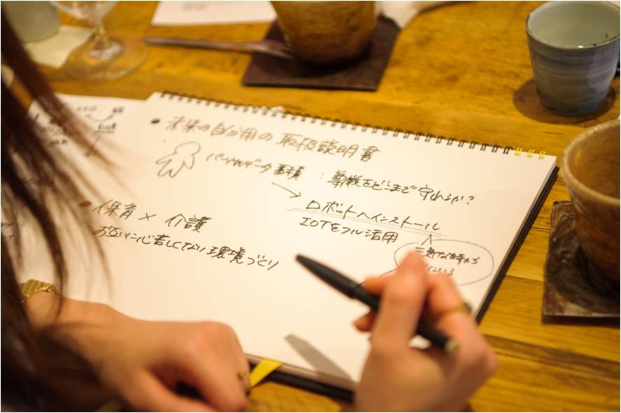 続いてグループに分かれ、どんなサービス、商品、施設などがあったら嬉しいかを話し合います。「年齢性別に関係なく誰もが立ち寄って交流できるような、地域に開かれた“場”があるといい」「若い人を見るだけで元気がもらえるだろうから、学校なんかを訪ねるツアーがあるといいかも」「それぞれが得意なスキルを活かしあいながら、ゆるくつながれるような“村”のような場所」「一人一台ドラえもんのようなロボットがあるといい。自分の好みなどの情報を全部インプットしておけば、うまく人に説明できないときでも助けてくれそう」など、思い思いのアイデアを出し合いました。