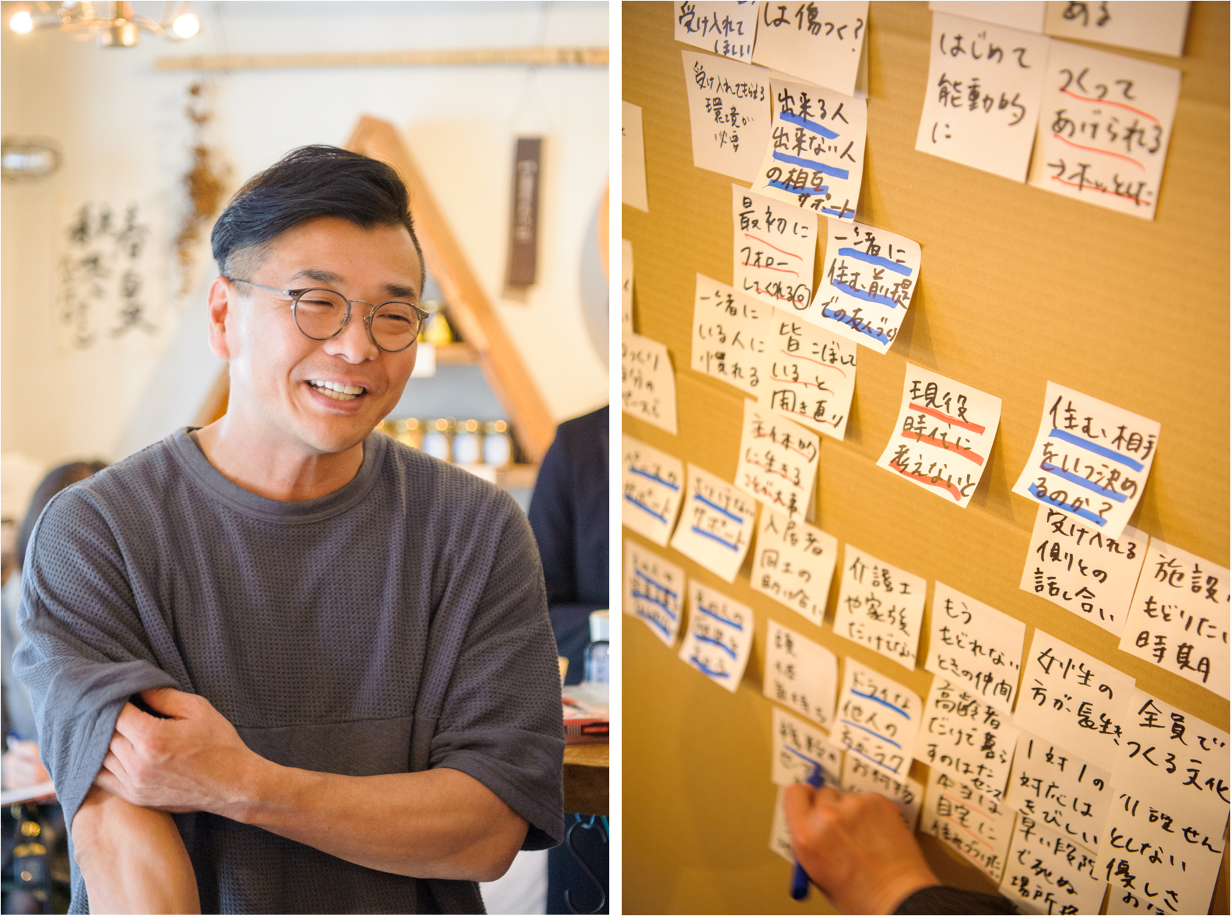 ディスカッションの途中では下河原忠道さんが運営する「銀木犀」についても説明。「入居者、家族、地域住民が少しずつ愛情を注げるような場所になるといいと思っています」という下河原さんのコメント通り、介護施設のイメージを一新するような建物のたたずまいや、入居者の自発的な行動が尊重され、あたたかく開かれた環境であることなどが紹介されました。また、下河原さんは第一部のプログラムについても、「目隠しをしてする食事の様子は、うちの入居者の様子にとても似ていて、驚いた。大変興味深い試みでした」と語りました。