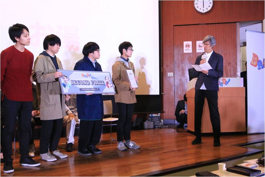 続いて、「ファーストプライズ(1位)」。選ばれたのはチーム「atoi」でした。プレゼンテーションの質の高さ、アニメなどを活用した調査のユニークさ、アイデアの実現性の高さが評価されました。優勝した「atoi」のメンバーは、「去年も同じメンバーで出演したが、予選で敗退したので、今年はリベンジが出来て本当に嬉しい。勝因は、“とにかくねばり強く考えたこと”だと思う。一人でも納得できない人がいれば何度も立ち返り考えた」と語りました。