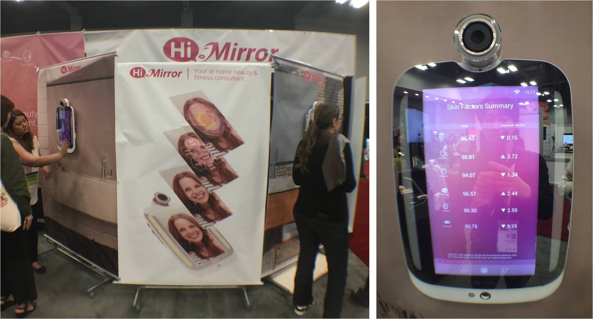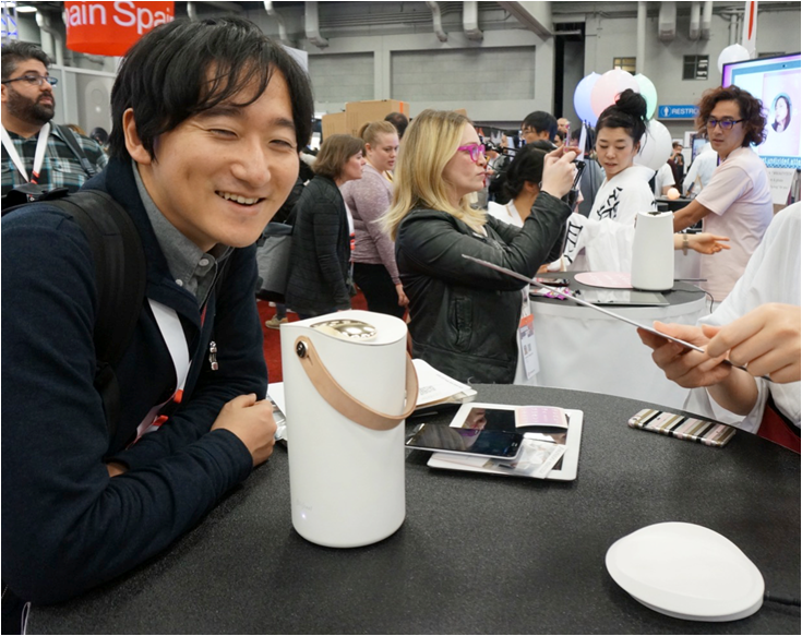 トレードショーに出展されていた製品の中で、私が今回、特に気になったのはアメリカと台湾の企業が開発した「Hi, Mirror」という製品です。ディスプレイにもなる鏡面の上にカメラがつけられており、このカメラで顔の写真を撮ると、そこから輝きや透明さ、キメなど、その日のお肌の状態を解析してデータを教えてくれます。データはどんどん蓄積されていくので、これまでに比べて肌質が良くなったのか、悪くなったのかも一目瞭然。そのため、今、使っている化粧品が肌質の改善に効果的なのかどうかが分かるのです。また、シミやシワの位置なども教えてくれるので、局所的なケアにも役立てることができ、ラインナップされている体組成計やポータブル型の肌質計測器とも連携することができます。このプロダクトは今年1月に開催されたエレクトロニクスの祭典、CES2017でもイノベーションアワードを受賞しています。